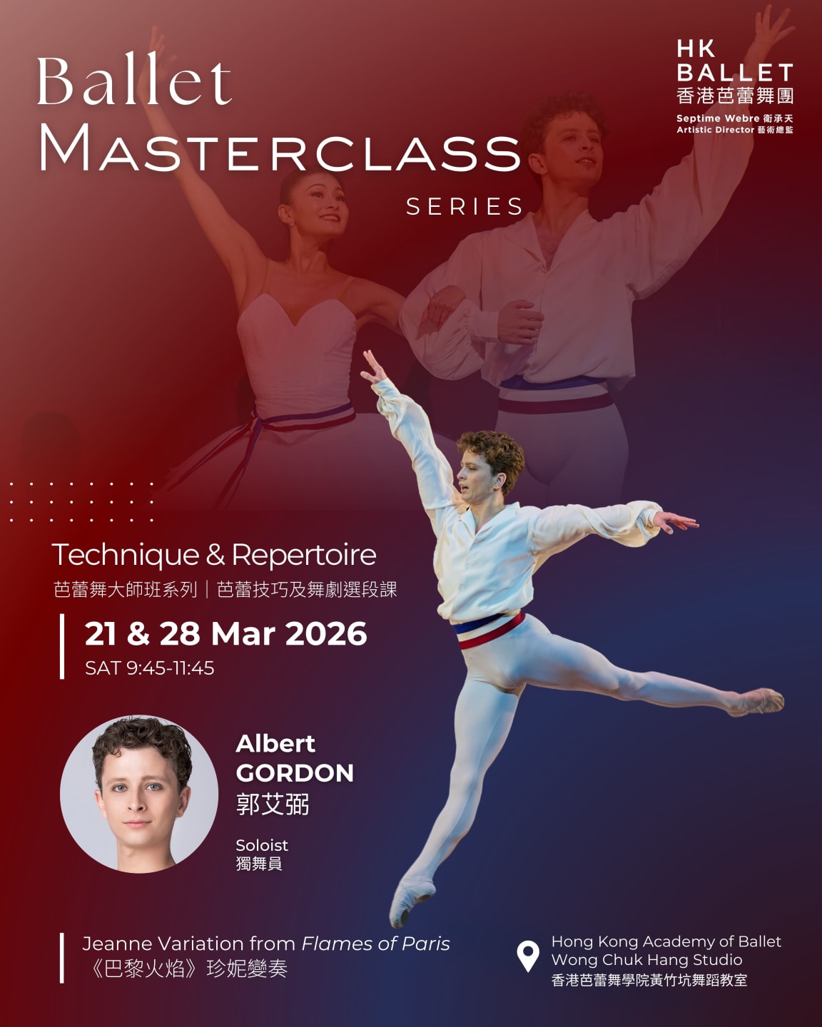 Join Albert Gordon (HKB soloist) as he teaches the spirited Jeanne Variation from Flames of Paris! This vibrant and energetic dance reflects Jeanne‘s joyful spirit and passion, and the intricate choreography demands precision and strength. These exciting masterclasses feature a complete barre and comprehensive explanations of ballet techniques and focuses on technique, musicality and performance quality.